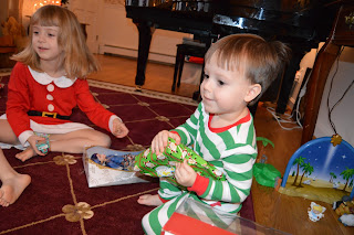 We had a wonderful meal at Grammy and Poppa's house. Poppa fixed the meat and we had lots of delicious sides and desserts. The boys were so excited though to open presents, they could hardly stand it!